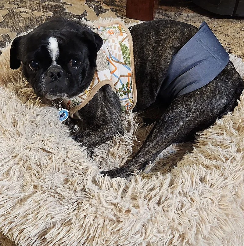 Hi, I'm Bert and I'm a very good boy! Being a pug and boston terrier mix, I have a black brindle coat with white markings, and the cutest face you'll ever see. My coloring is so unique, which brings me lots of attention which I just love! I also love my soft bed, playing with my dog friends, and plush squeaky toys. Walking on a leash is new to me, so I'm still learning how that works but getting better all the time.
